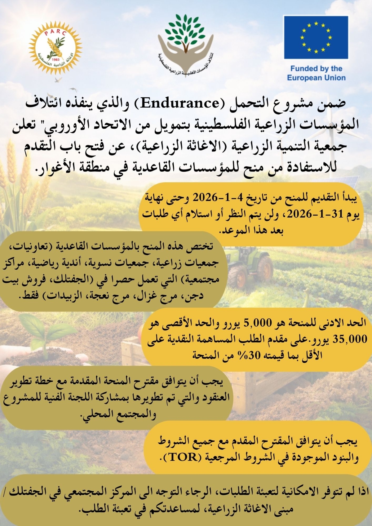 ضمن مشروع التحمل (Endurance) والذي ينفذه ائتلاف المؤسسات الزراعية الفلسطينية بتمويل من الاتحاد الأوروبي" تعلن جمعية التنمية الزراعية (الاغاثة الزراعية)، عن فتح باب التقدم للاستفادة من منح للمؤسسات القاعدية في منطقة الأغوار.