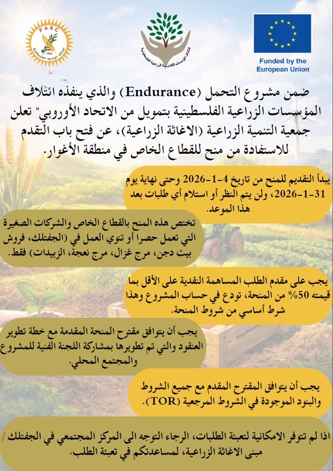 ضمن مشروع التحمل (Endurance) والذي ينفذه ائتلاف المؤسسات الزراعية الفلسطينية بتمويل من الاتحاد الأوروبي"  تعلن جمعية التنمية الزراعية (الاغاثة الزراعية)، عن فتح باب التقدم للاستفادة من منح للقطاع الخاص في منطقة الأغوار